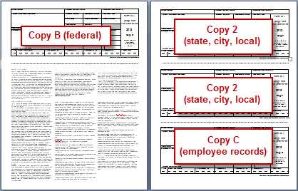 In special cases, some employees have more data and need more than two pages. For example, if an employee is subject to more than two local taxes, or has more than two items in Box 14, or more than four items in Box 12, we print additional copies of Form W-2 with just the additional data.