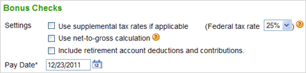 - Click the checkbox next to any special settings you want to apply to this bonus; for example, calculating net-to-gross or supplemental taxes. If you want different treatment for some employees, do more than one bonus run.