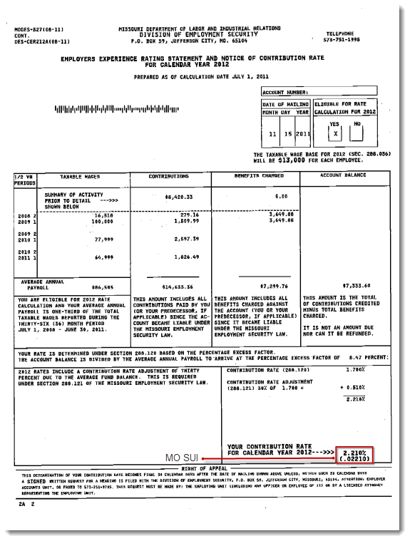 Move your mouse over the image to see an example Missouri SUI rate notice, or click here to open in a separate window. This is only an example — see your own notice for your specific rates. |